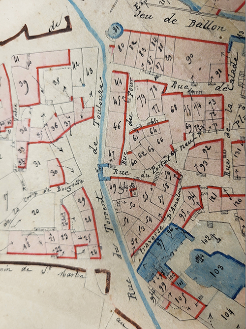- De l’autre côté de l’Ayet, faisant face aux remparts, le tènement de la condamine borné par le chemin vers Aniane et le chemin du moulin du seigneur. La rue du quartier forma un angle tendant vers Viols-le-Fort (aujourd’hui rue des Barrys).